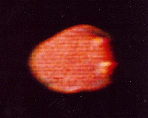 - It has an irregular (non-spherical) shaped and a reddish colour.