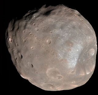 Phobos is the larger and closer of the two moons of Mars. It orbits 6,000 km (3,700 mi) from Mars, closer to its planet than any other moon.