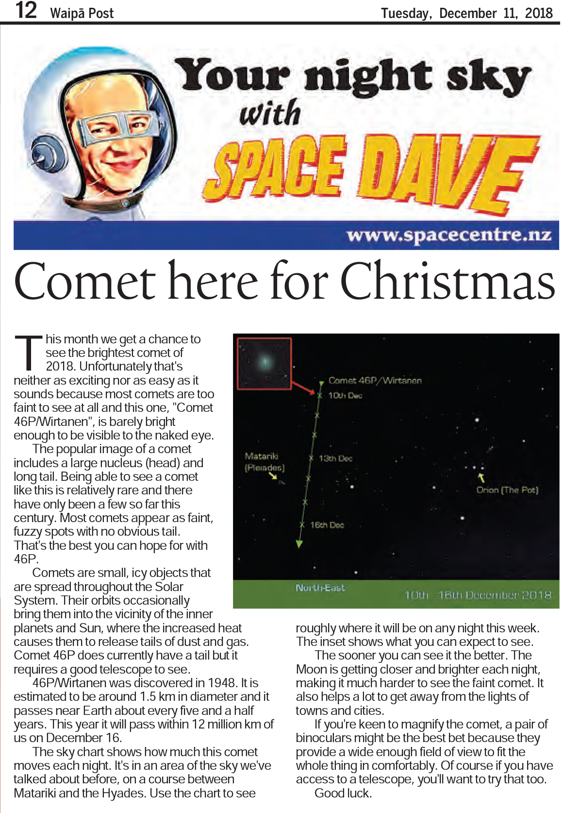 46P/Wirtanen was discovered in 1948. It is estimated to be around 1.5 km in diameter and it passes near Earth about every five and a half years. This year it will pass within 12 million km of us on December 16.